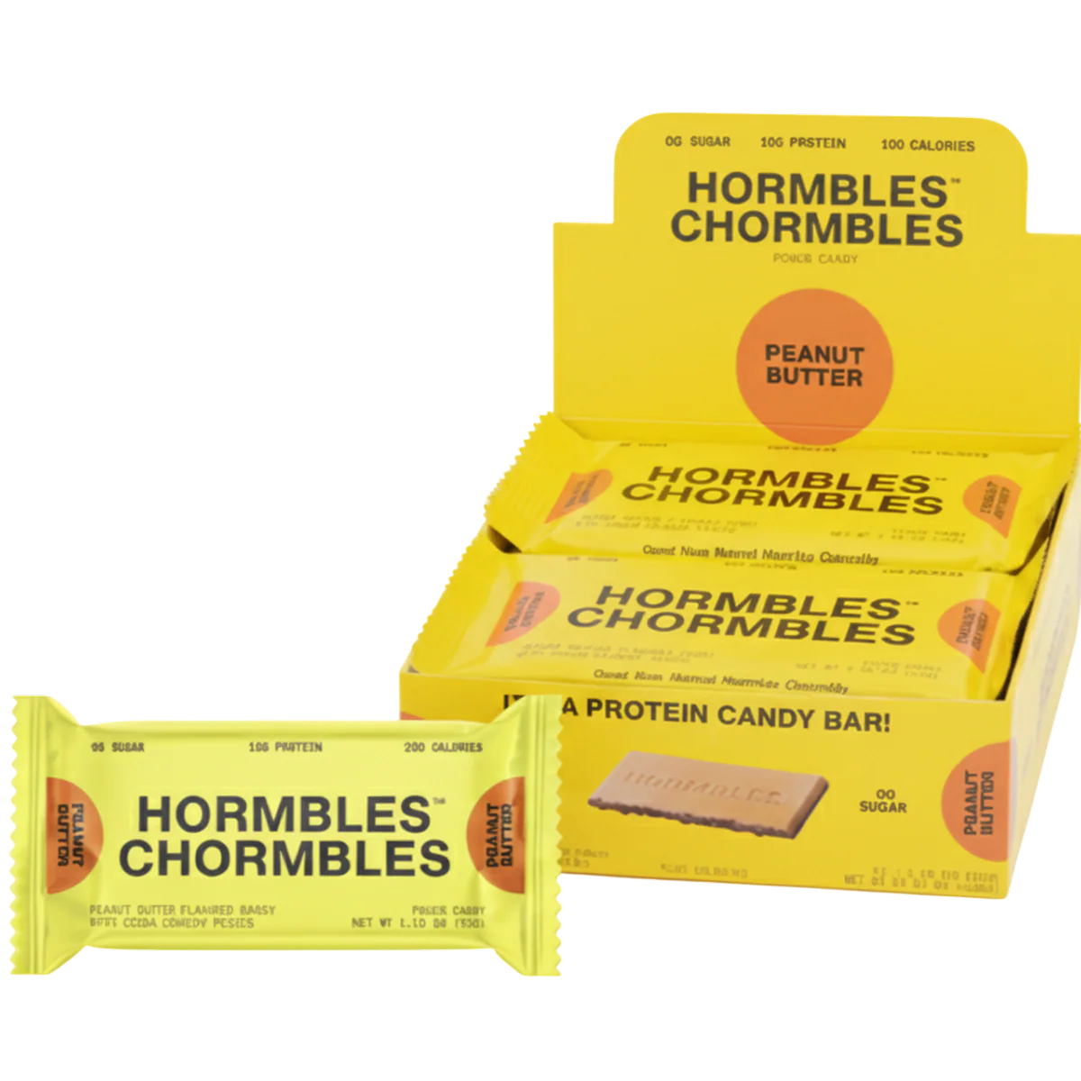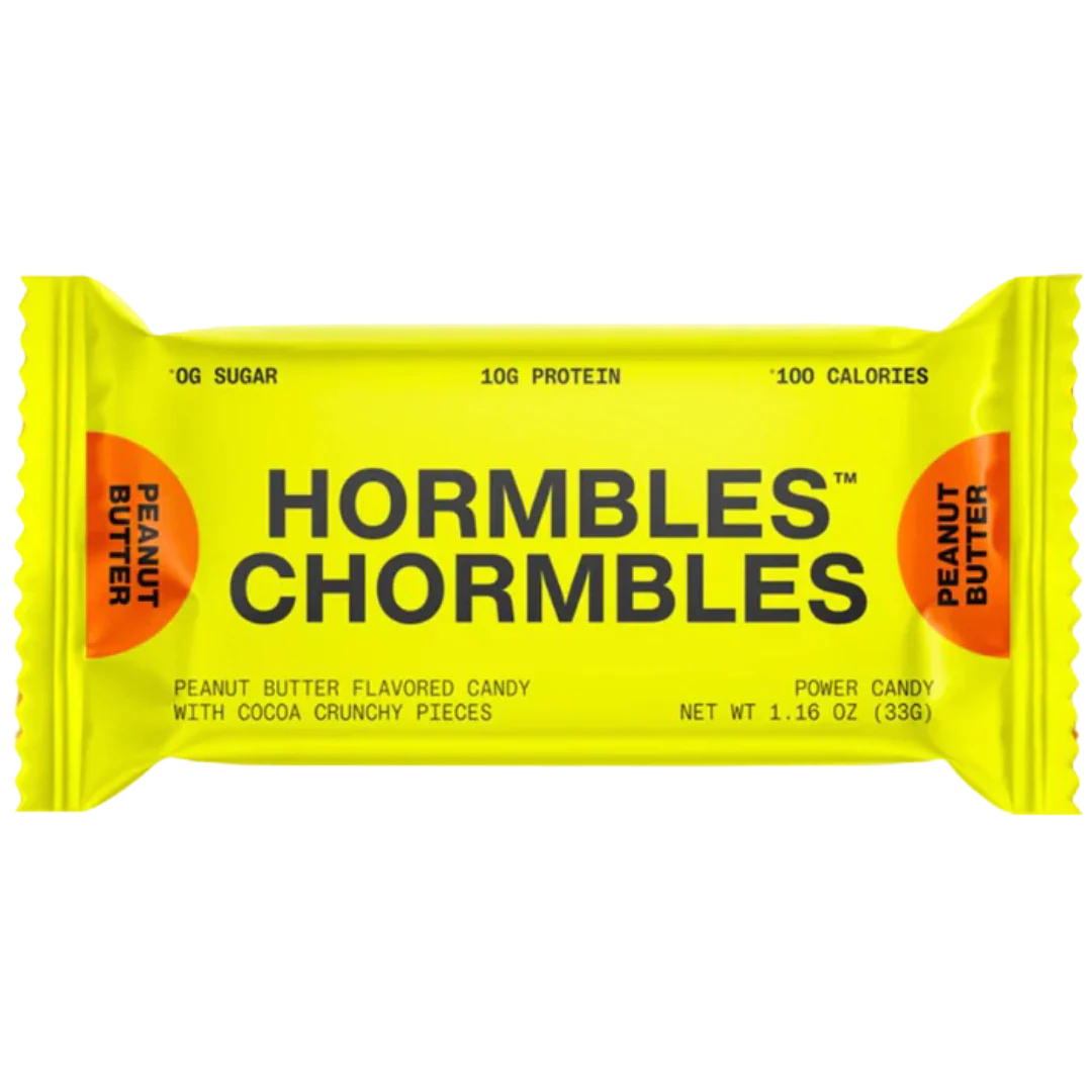 Hormbles Chormbles Peanut Butter Protein Candy Bars offer a creamy peanut butter flavor combined with crunchy cocoa bits for an indulgent snack experience. Each bar delivers 10 g of protein, 0 g of sugar, and 100 calories, making it a satisfying, guilt‑reduced treat that balances taste and nutrition.